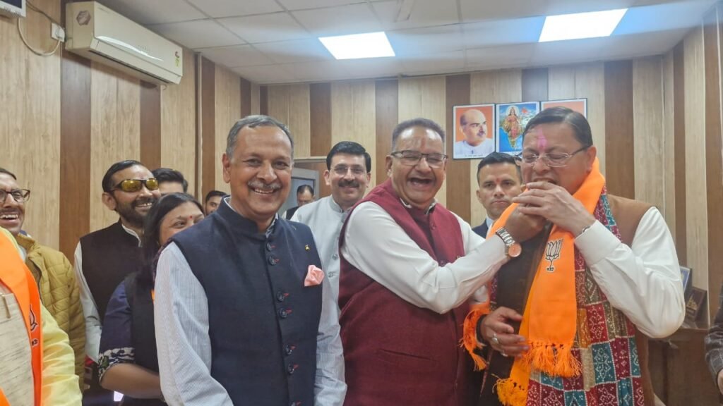 बिहार चुनाव में बीजेपी की जीत को लोकतंत्र की जीत बताते हुए गणेश जोशी ने मुख्यमंत्री पुष्कर सिंह धामी को मिठाई खिलाकर शुभकामनाएँ दीं